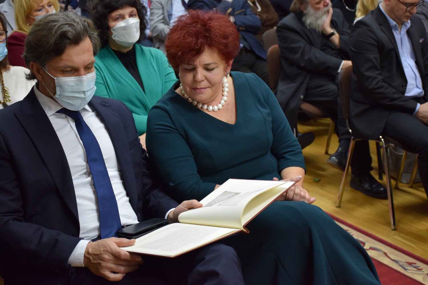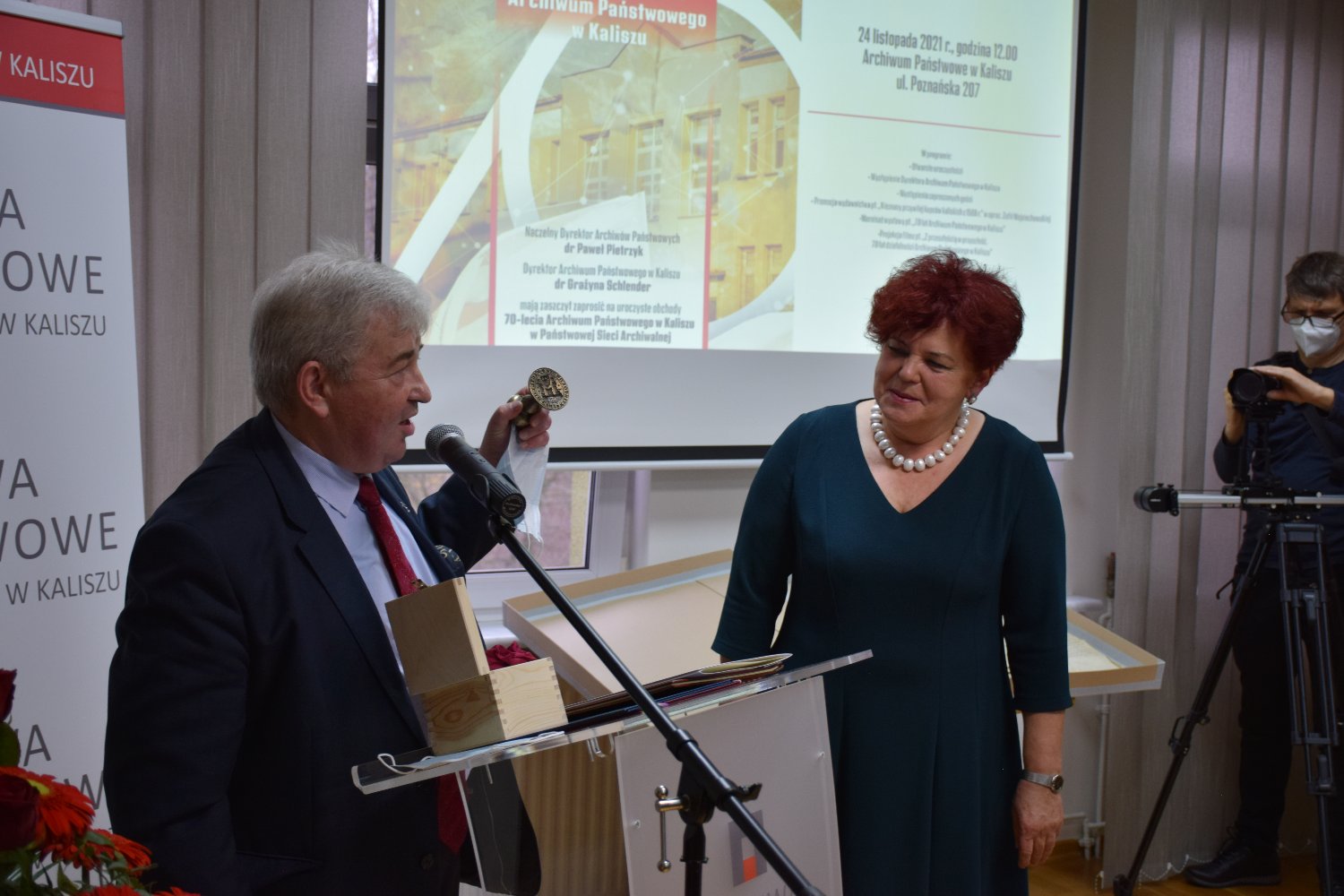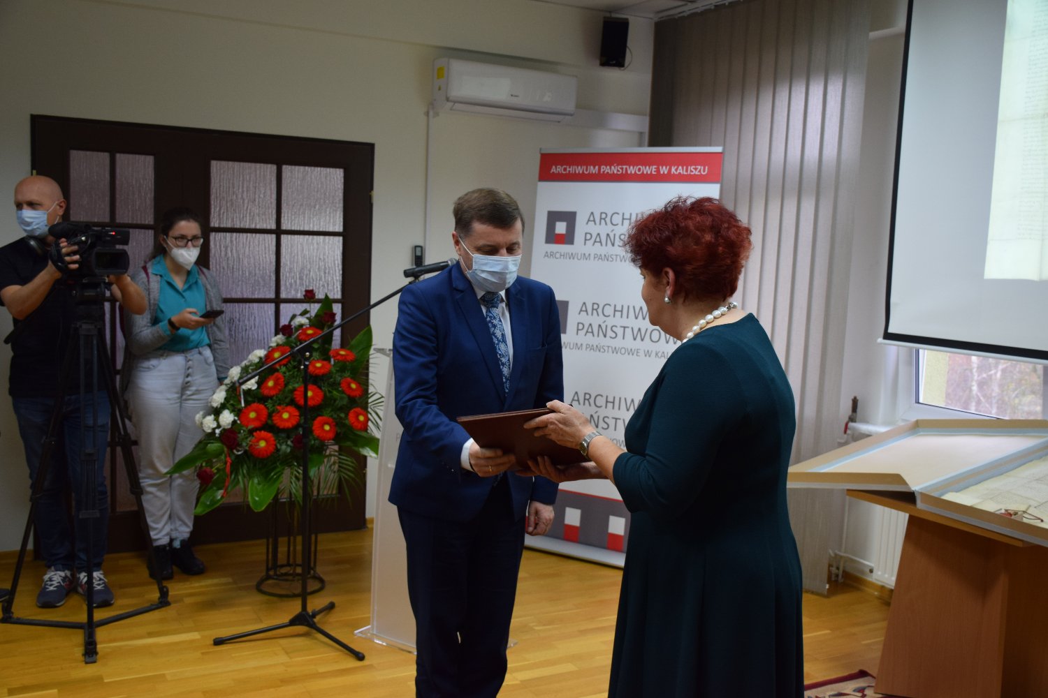 - Dzięki temu konkursowi młodzi ludzie w zupełnie inny niż w szkole sposób uczą się historii. Ale przede wszystkim przeżywają niesamowitą przygodę, związaną z poszukiwaniem korzeni swojej małej ojczyzny. A kto wie – być może przy okazji także z odkrywaniem tajemnic swoich przodków. Tym bardziej cieszę się, że mogę obejmować konkurs swoim patronatem. Podkreślić należy, że ta edukacyjna działalność Archiwum Państwowego w Kaliszu nie ogranicza się tylko do dzieci i młodzieży. Świętująca dziś swój jubileusz placówka ma także wiele innych propozycji dla każdego mieszkańca regionu. Dużą popularnością cieszą się wystawy, również te on-line, przypominające i odkrywające minione czasy, prelekcje, cykle filmowe. Bardzo cenię działalność naukową Archiwum. Jej przykładów jest wiele, a dzisiaj mamy prezentację jednego z nich. Opracowanie nieznanego dotąd szerzej przywileju kupców kaliskich z 1568 roku, które rzuca nowe światło na kolejną kartę w dziejach miasta. Archiwum, zresztą nie pierwszy raz, w ten sposób dopisuje historię naszego miasta – mówił Krystian Kinastowski, prezydent Miasta Kalisza. - Szanowna Pani Dyrektor, drodzy pracownicy Archiwum Państwowego. Serdecznie gratuluję jubileuszu siedemdziesięciolecia Waszej instytucji. Miasto Kalisz jest dumne, że w jego granicach tak prężnie działa Archiwum Państwowe. Życzę kolejnych owocnych lat działalności na rzecz gromadzenia i upowszechniania ważnych dla Ziemi Kaliskiej dokumentów. Wszystkiego dobrego!