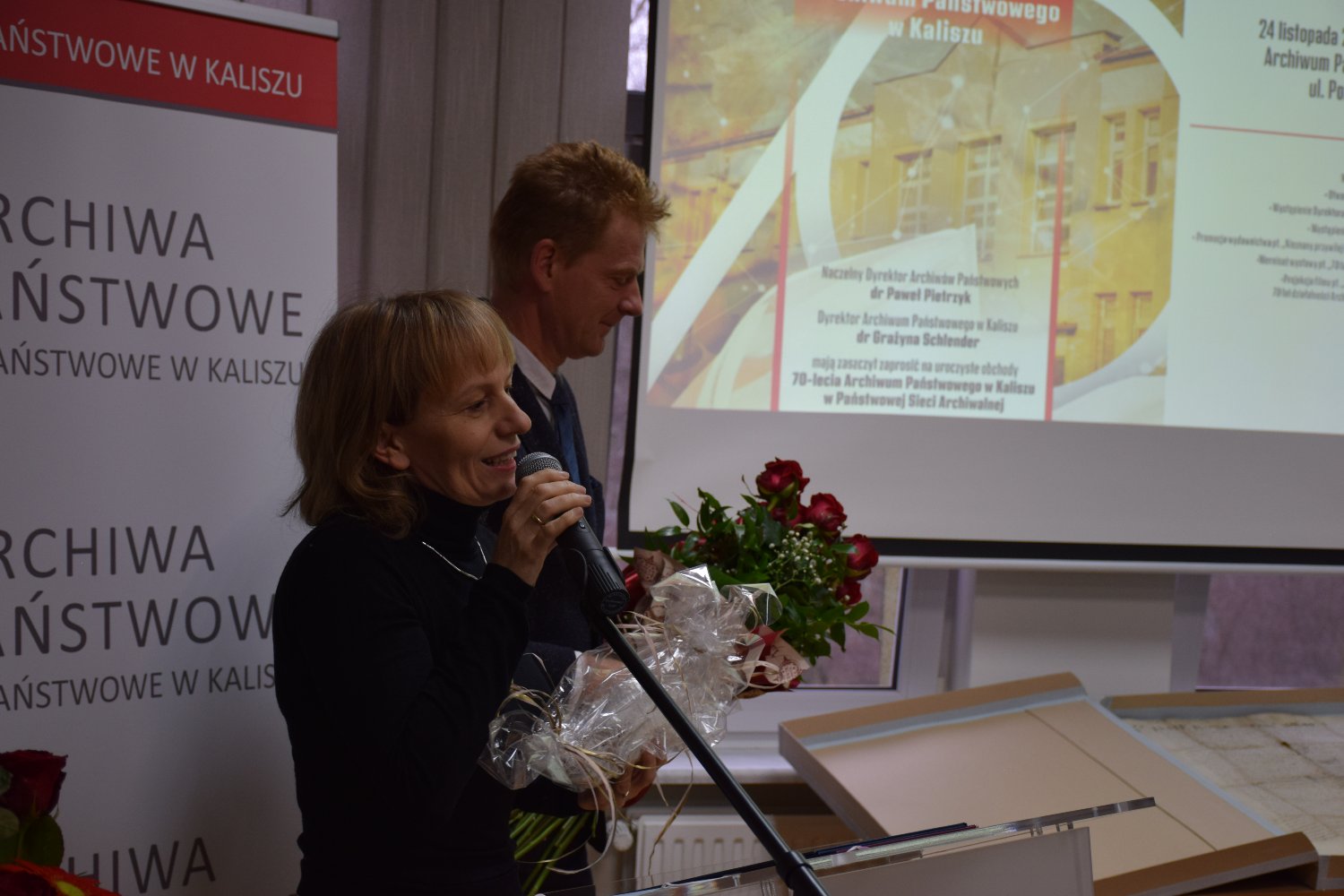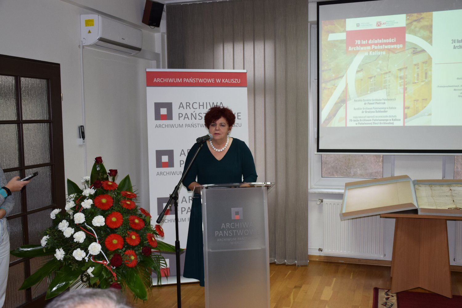 W tym roku Archiwum Państwowe w Kaliszu świętuje 70 lat istnienia. Z tej okazji w siedzibie placówki odbyły się uroczyste obchody jubileuszu. Przybyłych Gości powitała Grażyna Schlender, dyrektor Archiwum Państwowego w Kaliszu.