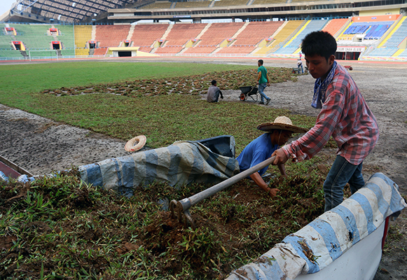 Tu pasallah jahanam rumput kat Stadium ni (walaupun dikatakan ada faktor rekabentuk yang turut menjadi penyebab rumput sukar nak bertahan lama) ...... macam-macam jenis rumput dah cuba, berjuta-juta ringgit dah dilabur dan lebur, sampai ujud 'perang saraf' pasal kos tanam rumput ni, perli sana, perli sini, suruh tukar rumput sintetik pulak…