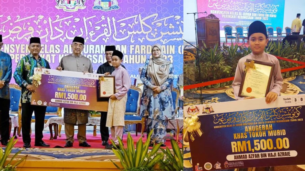 MELAKA: Qari Cilik Ahmad Azfar Azraie, 12, dinobatkan sebagai penerima Anugerah Khas Tokoh Murid Kelas al-Quran dan Fardhu Ain (KAFA) 2023 pada Konvensyen KAFA Peringkat Kebangsaan di MITC Melaka, hari ini.