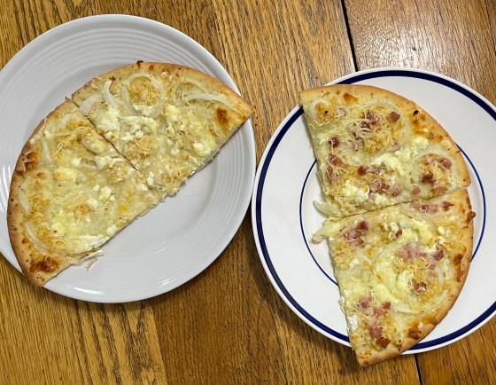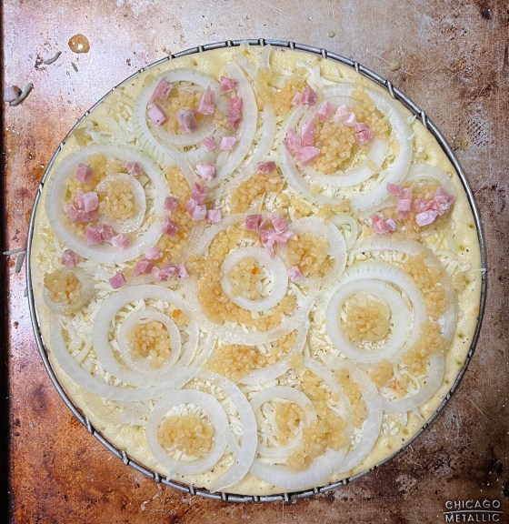 We each have particular tastes in pizzas, so these were accommodated. An olive oil base, thinly sliced onions, jarred chopped garlic, mozzarella and goat cheese made for a mighty tasty pizza. My half got a sprinkling of pancetta.
